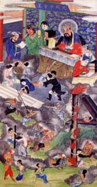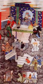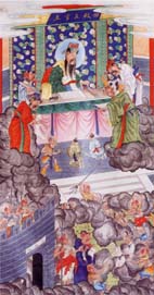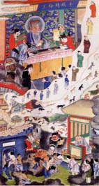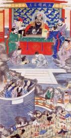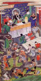據《靈寶經》記載:北陰酆都山有十殿冥王,由十方救苦天尊所化,掌管地獄十宮。分別為一殿秦廣王、二殿楚江王、三殿宋帝王、四殿五官王、五殿閻羅王、六殿卞城王、七殿泰山王、八殿都市王、九殿平等王、十殿轉輪王。